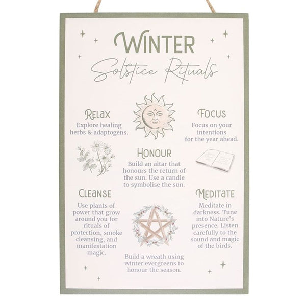This lovely 30cm MDF painted wall hanging sign highlights a selection of traditional rituals to welcome the Winter Solstice. Also known as the returning of light, Winter solstice is the longest night and shortest day of the year and marks the start of winter. It is an ancient pagan holiday known for traditions and rituals that celebrate nature, rebirth, transformation and the oncoming season. Embrace the spirit of the Winter Solstice with these celebratory rituals beautifully depicted on the sign: Relax, Focus, Honor, Cleanse, Meditate and Build a wreath using winter evergreens.