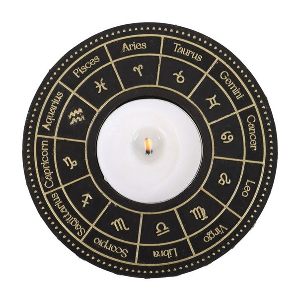 This beautiful tealight candle holder depicts the astrology wheel in intricate, gold-effect detail that looks beautiful when a lit candle is placed in the centre. A perfect finishing touch for any home with a celestial-inspired decor.