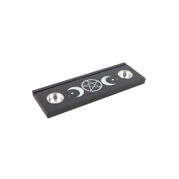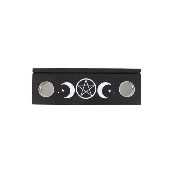 Display tarot card readings with this black wooden triple moon tarot card stand, complete with two spaces for holding tealight candles to create ambiance and allow the meaning of the cards to resonate. Whether it's used for displaying treasured tarot cards for their meaning or their unique design, this piece will add mystical allure to any home.