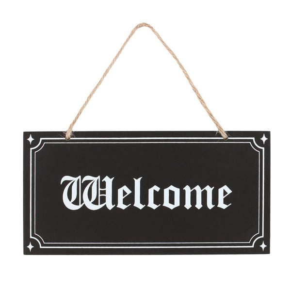 Welcome visitors into your home and create your desired gothic aesthetic with this hanging 'Welcome' sign in black with timeless vintage style font lettering.
