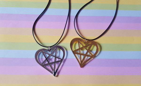 * mirrored acrylic pendant hung from black rubber cord * fastens with silver tone lobster clasp fastener * total length of cord measures approx. 18" (plus extender chain) * pendant measures approx. 50mm x 45mm