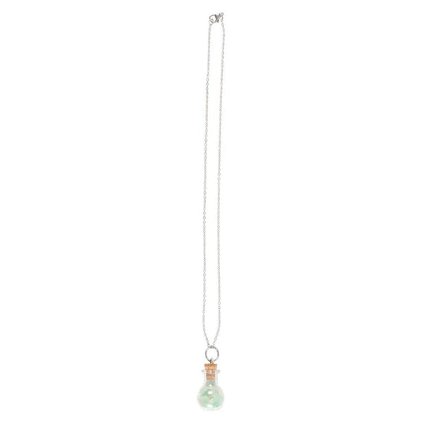 Give the gift of crystal magic with this miniature potion bottle necklace. With natural green aventurine crystal chips and a cork stopper, this necklace serves as a spellbinding accessory while attracting luck, wealth and prosperity. Presented in a matching gift box and perfect for that special witch in your life. Plastic bottle on a nickel-free stainless steel chain.