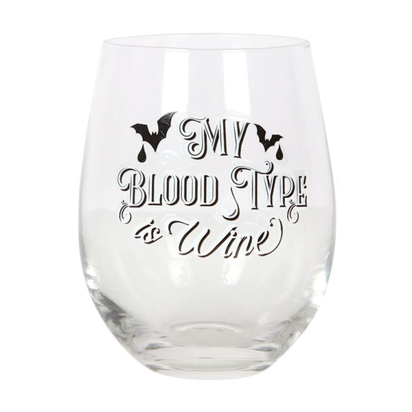 This stemless wine glass features 'My Blood Type is Wine' text with gothic bat designs. Perfect for sipping red wine after a long night of mischief. 500ml capacity. Do not microwave. Hand wash only. Product Dimensions: H12cm x W9.2cm x D9.2cm Packaged Dimensions: H13cm x W10cm x D10cm