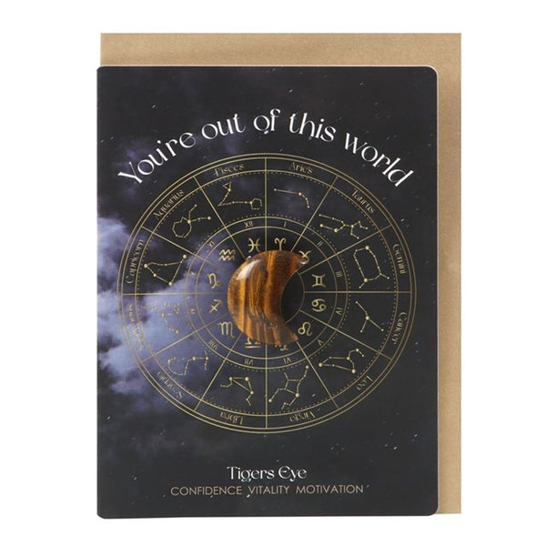Remind someone how truly special they are with this 'You're Out of This World' greeting card. Featuring an intricate astrology wheel design and a beautiful crescent moon shaped crystal crafted from Tiger's Eye, this gift and card in one is designed to inspire confidence, vitality and motivation. Includes envelope. Blank inside for your own message.