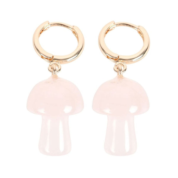 These enchanting mushroom earrings are crafted from polished rose quartz. The mushroom-shaped gemstones harness the power of crystal healing, and are attached to small gold hoop earrings with a matching informational tag. Rose Quartz is a popular stone that promotes self-love, confidence and compassion by fostering a sense of peace and harmony in the mind, body and soul. Due to its nature, stone may vary in size, shape and colour.