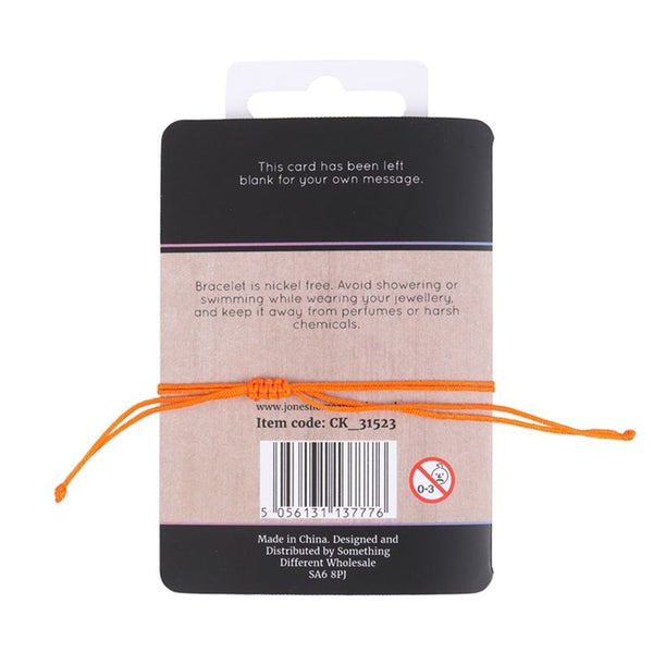 Balance and realign the sacral chakra with this orange string and metal charm bracelet. Presented on a matching backing card that reads, 'Creativity, sexuality, feelings, emotions, pleasure'. Product Dimensions: H1.9cm x W2.4cm x D0.8cm Packaged Dimensions: H2.3cm x W13cm x D2cm