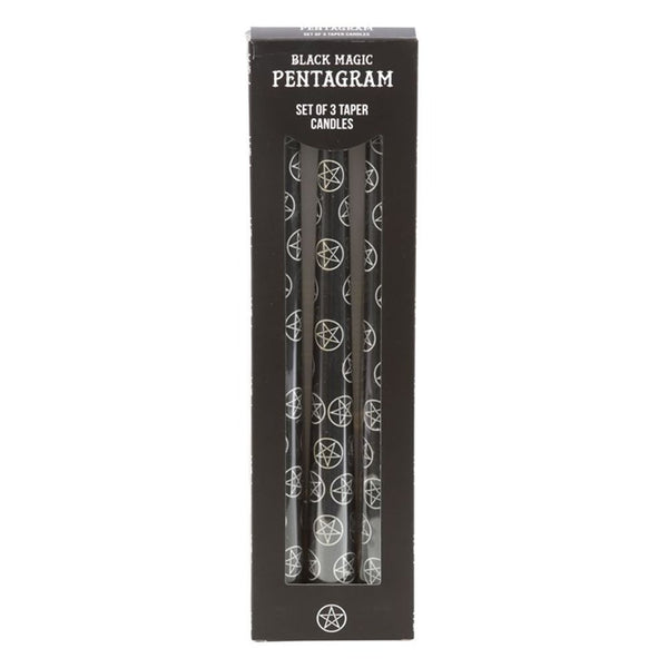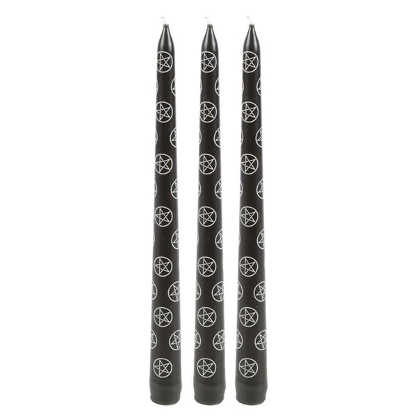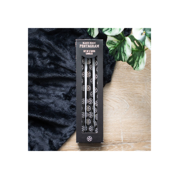 This pack of 3 black taper candles are perfect for adding final finishing touches to a table setting or adding decorative accents around the home. Adorned with a mystical pentagram design, the candles offer the perfect blend of elegance and magical symbolism and are a must-have for anyone seeking to add a unique touch to their living space.