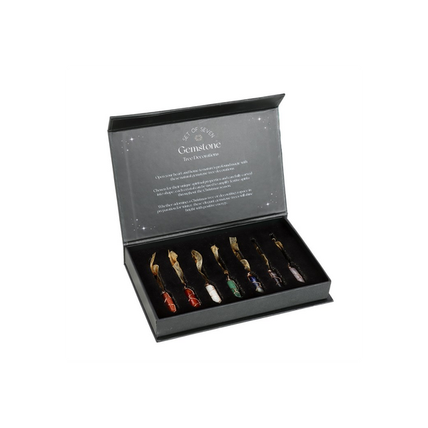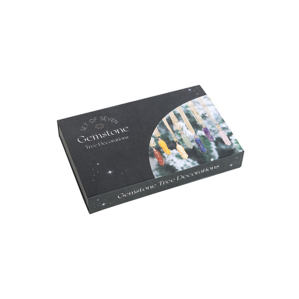 Adorn your Christmas tree with this set of 7 hanging crystals, each chosen for its unique spiritual properties. Featuring goldstone for beauty, orange carnelian for motivation, yellow jade for positivity, green aventurine for good luck, sodalite for harmony, amethyst for tranquility, and rose quartz for togetherness, these crystals will amplify festive spirits throughout the Christmas season. Perfect for creating a harmonious and joyous atmosphere, these sparkling ornaments not only beautify your tree but also enhance the energy of your home. As each crystal is unique, stone shape and colour may vary from photos shown.