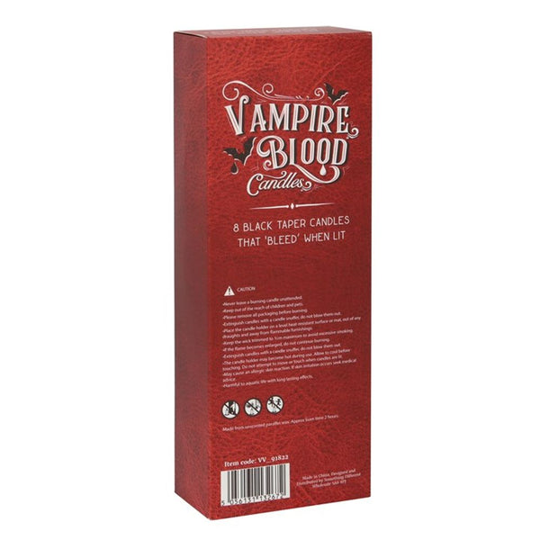 From candlelit dinners to eerie mood lighting, this set of Vampire Blood taper candles will entrance guests with their eye-catching, bleeding wax effect. Place these black and red candlesticks in an ornate candelabra for a truly bewitching display when the warm wax 'bleeds' down its sides. Sold in boxes of 8. Approximately 2 hour burn time per candle. Unscented paraffin wax. Protect surfaces before burning and never leave lit candles unattended. Product Dimensions: H25.5cm x W9cm x D4.5cm Packaged Dimensions: H25.5cm x W9cm x D4.5cm