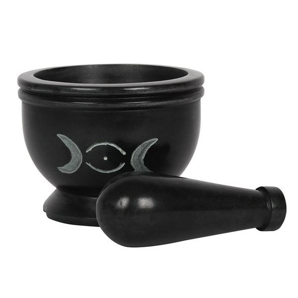 This carved soap stone mortar and pestle is an essential tool for crushing and grinding herbs in a variety of sacred rituals. This style is accented by a carved triple moon design on the side and is great for display or a witch's kitchen.Product Dimensions: H9cm x W9cm x D9cm Packaged Dimensions: H14cm x W11.5cm x D11.5cm