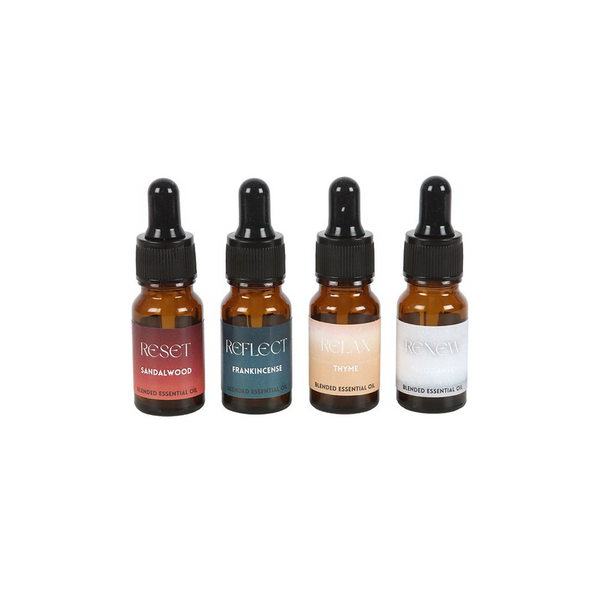 Pause and reset with this Meditation collection of ready to use, blended essential oils. The set contains 4 x 10ml bottles with a dropper tool lid, helping to apply just the right amount of oil for each use. The scents you'll discover in this set are: Reset - Sandalwood, Reflect - Sandalwood, Relax - Thyme, Renew - Palo Santo.