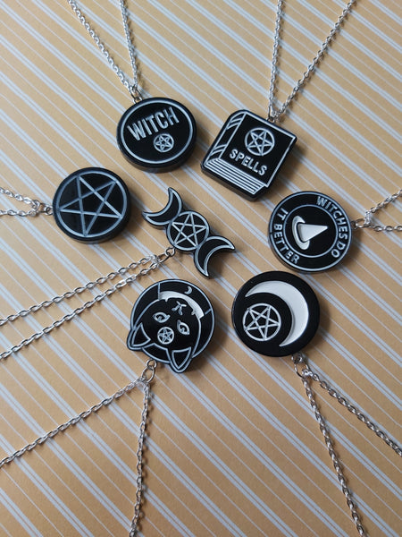 Made with resin pendants hung from a silver plated chain with a silver tone lobster clasp fastener. The chain measures approx. 16". Pendant sizes vary: black cat approx. 29mm, pentagram moon approx. 29mm, pentagram approx. 29mm, spell book approx. 29mm x 26mm, triple moon approx. 33mm x 15mm, witch approx. 29mm, witches do it better approx. 29mm.