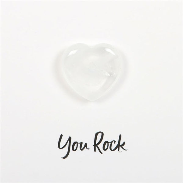 Give the gift of positivity with this meaningful crystal greeting card. Includes a small clear quartz crystal heart attached to a greeting card with ‘You Rock’ text. Clear quartz is known as the master healing stone and helps one avoid negative feelings by promoting positivity and patience. Card left blank inside. Envelope included.