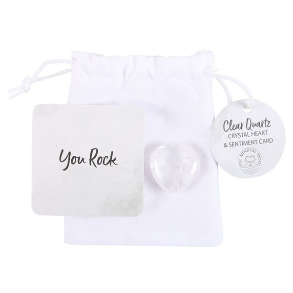 Promote clarity, peace and the purification of negative energies with this lucky clear quartz crystal heart. Presented in a white velvet drawstring bag, this charm makes a meaningful token of inspiration and empowerment for anyone in need of some extra positivity. Includes a charming "You rock" sentiment card.